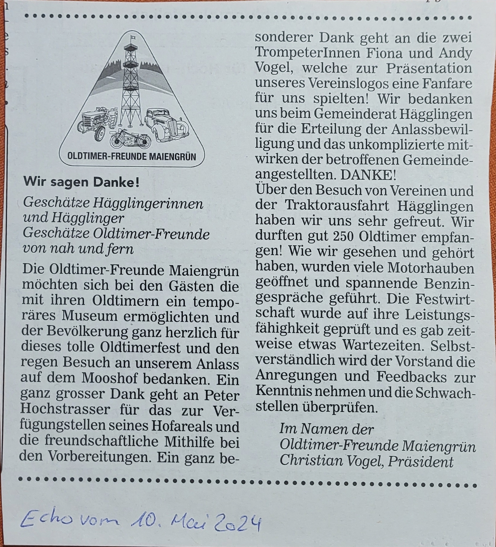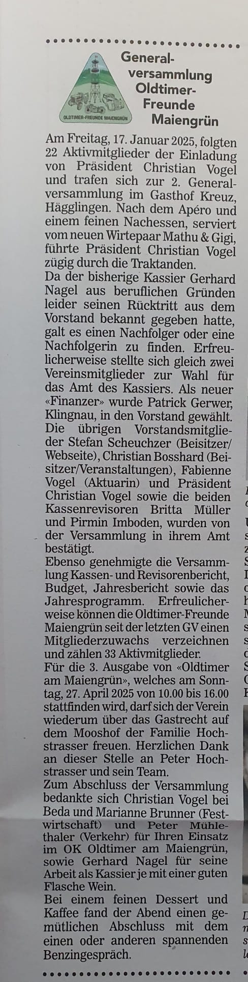 Bericht über die zweite GV der „Oldtimerfreunde Maiengrün“: