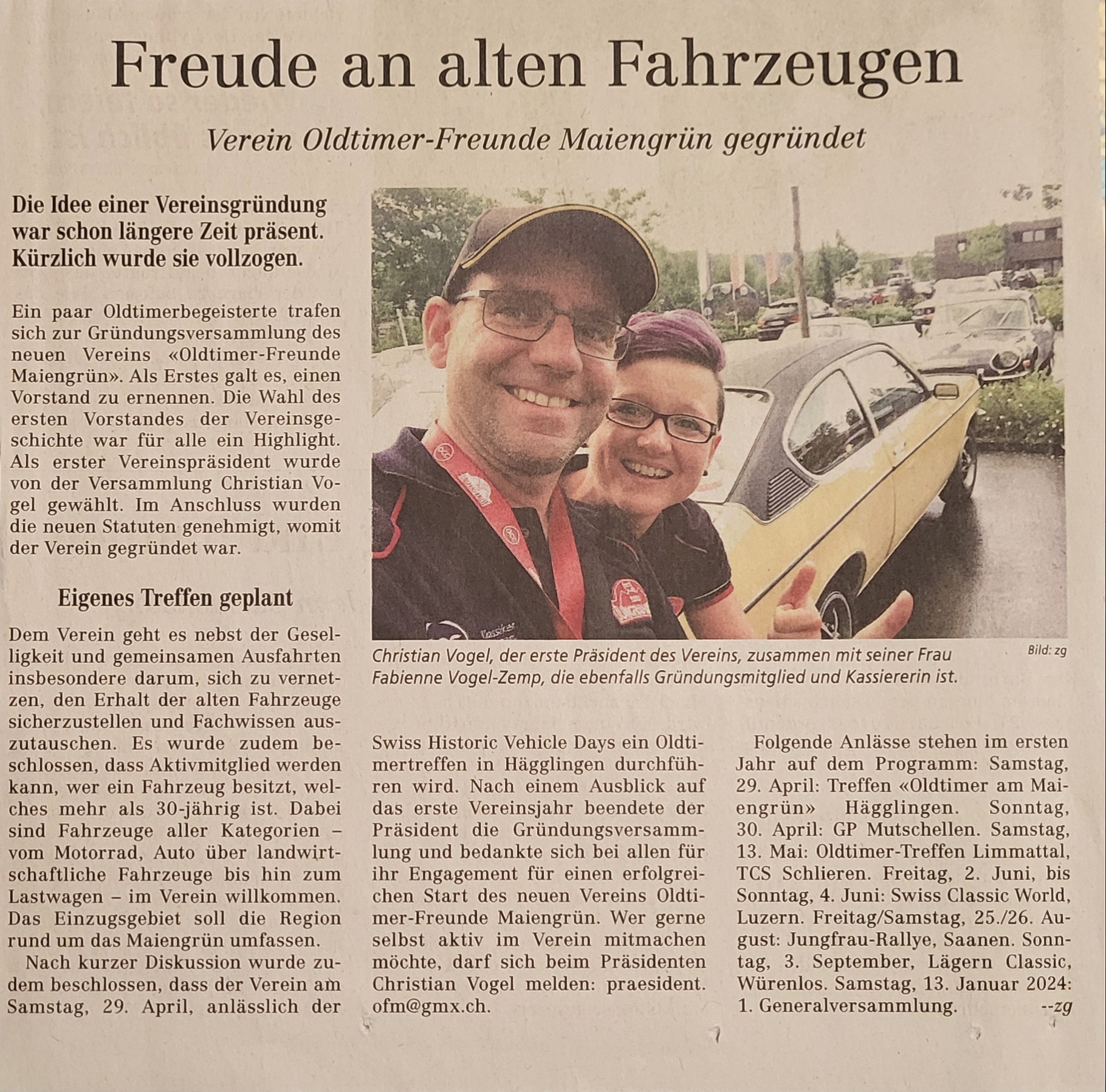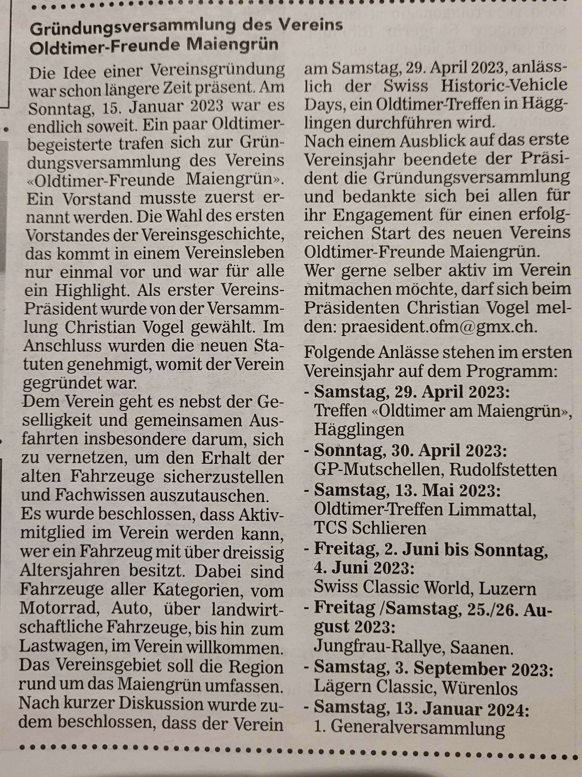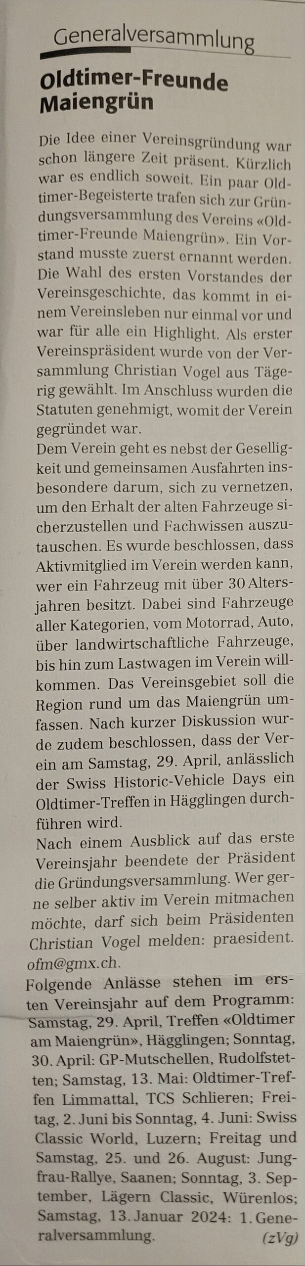 Bericht über die Gründung des Vereins „Oldtimer Freunde Maiengrün“: